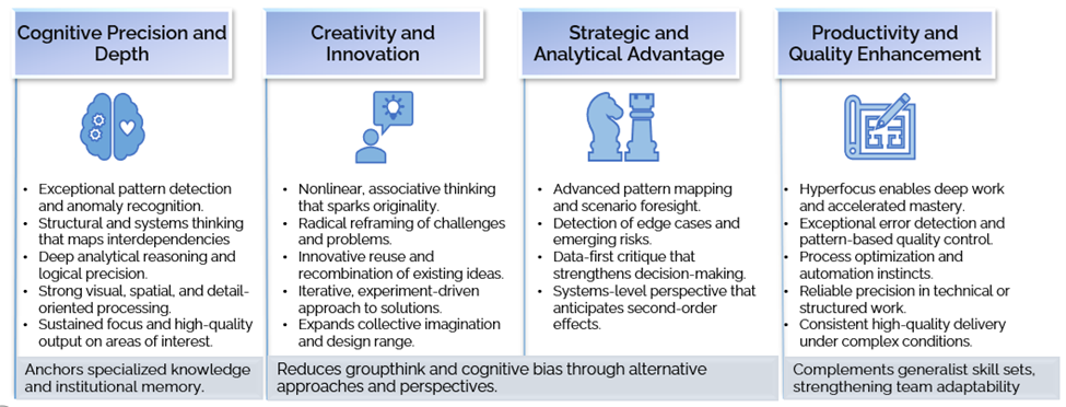 Growing up gifted and autistic, Rao learned early how workplaces often reward speed and visibility while overlooking depth. She can notice patterns, anticipate challenges, and approach problems differently than many of her colleagues, but those abilities are only valuable if the system is wired to receive them. The SNF provides this interface. It allows the organization to leverage high-resolution thinking for collective impact and demonstrates how processes can be built for cognitive diversity.